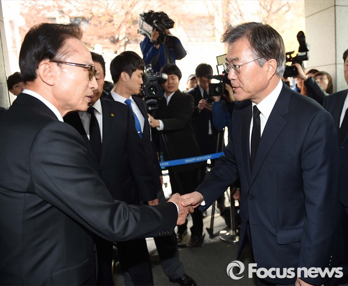 | △ 김영삼 전 대통령이 서거한 22일 오전 서울 종로구 서울대병원 장례식장에 마련된 김 전 대통령 빈소에서 이명박 전 대통령과 문재인 새정치민주연합 대표가 만나 악수하고 있다. 2015.11.22 사진공동취재단 photo@focus.kr |