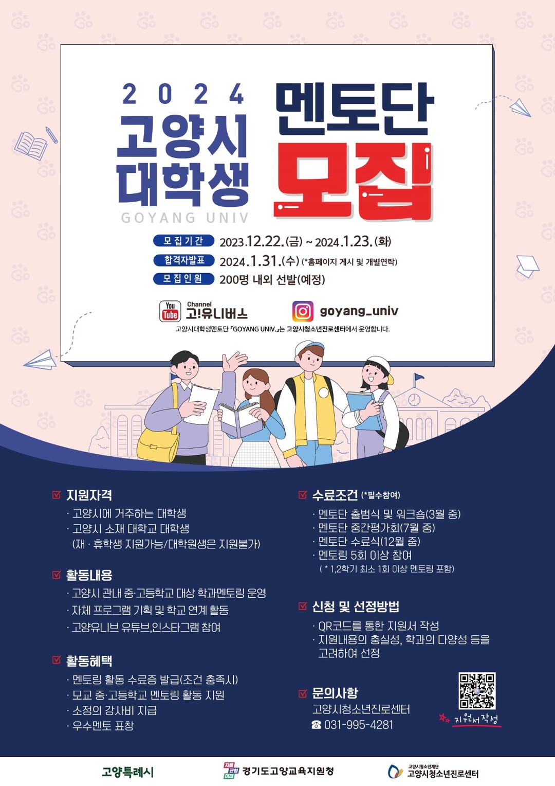 신청 방법은 고양시청소년진로센터 누리집 또는 포스터상의 큐알코드를 통해 확인할 수 있다. 신청은 2024년 1월 23일까지이며 기타 서류는 합격 이후 안내에 따라 제출하면 된다.