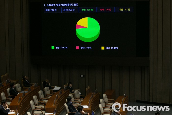 정의화 국회의장은 2일 밤 본회의를 열고 이같은 내용의 소득세법 개정안이 재석 267인 중 찬성 195표, 반대 20표, 기권 52표로 가결됐음을 선포했다.