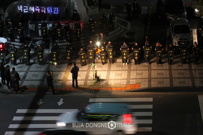세월호 기억공간 리본(re:born)은 9일 오후 제주시청 조형물 앞에서 세월호 참사 1000일을 맞아 검은 옷과 마스크를 쓰고 침묵하는 '블랙 기억 퍼포먼스'를 진행했다. 이날 시민들은 사회관계망서비스(SNS)를 통해 자발적으로 모여 추모식에 함께 했다. 2017.01.0