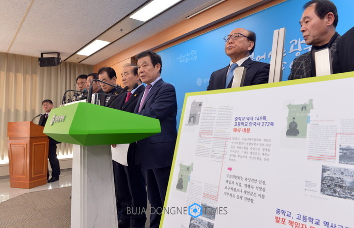 윤장현 광주광역시장, 장휘국 광주광역시죠육감 등 518역사왜곡대책위원들이 1일 오후 광주시정 5층 브리핑룸에서 국정역사교과서 철회를 요구하는 기자회견을 하였다.