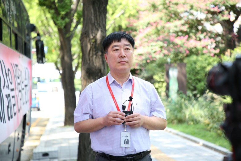 (지난 3일 서울지하철 보라매공원역 앞에서 위아원 서울경기서부 지역연합회 영등포지부와 함께 2024 위아레드 헌혈 캠페인을 주최한 대한적십자가 노영식 팀장이 인터뷰를 하고 있다)