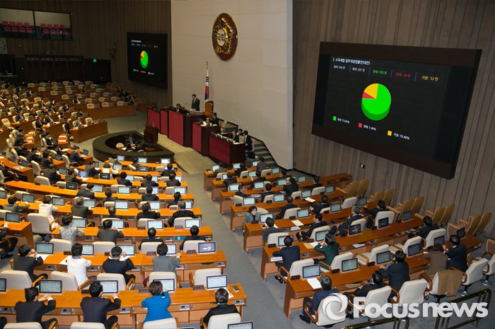 | △ 2일 오후 서울 여의도 국회에서 열린 337회 국회(정기회) 13차 본회의에서 소득세법 일부개정법률안(대안)이 재석 267인 중 찬성 195인, 반대 20인, 기권 52인으로 통과되고 있다. <사진제공=포커스뉴스> |