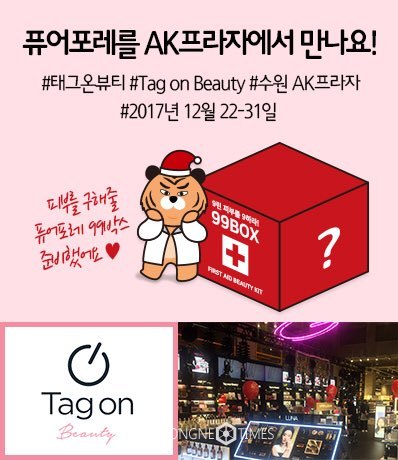 또한, ‘태그온뷰티’ 팝업 스토어 이벤트로 ‘9린 내 피부를 9하라!’라는 피부’구구박스(99BOX)’ 이벤트를 진행한다. 트러블, 민감성, 수분케어, 지성케어등 4가지 피부 고민별케어를 선택할 수 있는 럭키박스로구성하였으며, 9,900원 가격대로 최소 1만5천원~최대 5만원 이상의 스킨케어 제품을 받을 수 있는 혜택을 제공한다. 자신의 피부타입을 모를 경우 ‘피부구조대’가 박스를 추천해 준다.