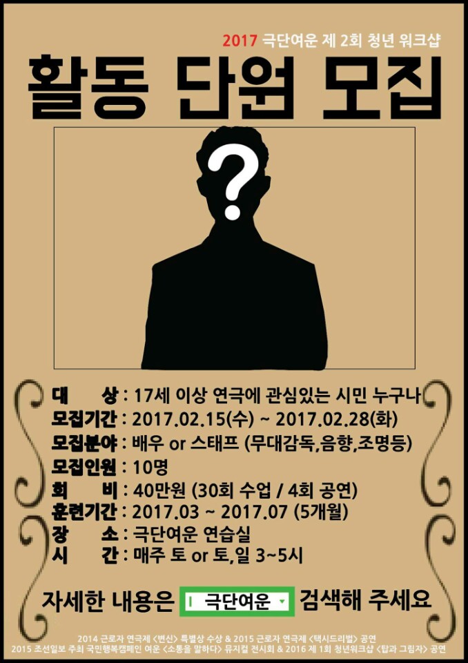 △ 극단 여운, 2017 청년 워크샵 활동단원 모집 포스터