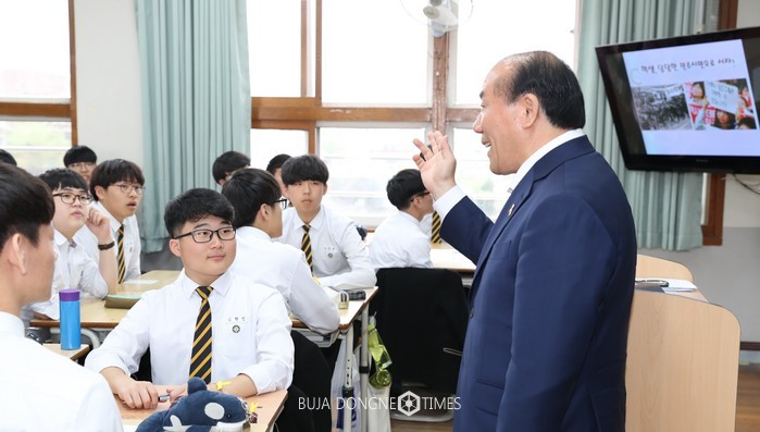 | △장휘국 교육감은 제57주년 4.19혁명 기념일을 하루 앞둔 18일 모교인 광주고등학교 2학년 4반 학생들을 대상으로 특별수업을 진행했다 |