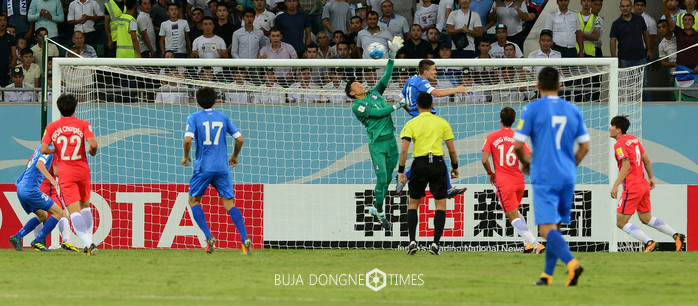 한국은 수비에 집중한 후 역습을 노렸지만 우즈벡의 압박을 뚫지 못했다. 위기의 순간도 있었다. 전반 20분 카이다로프가 페널티 아크 정면에서 기습적으로 날린 중거리 슈팅이 골대를 맞고 나오며 가슴을 쓸어내렸다.