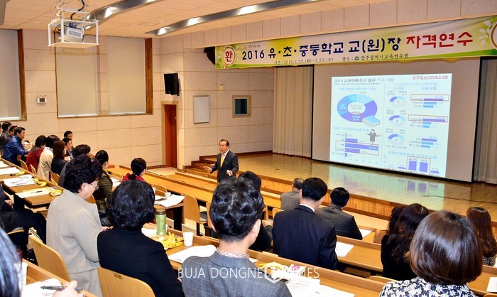 장휘국 광주시교육감은 22일(화) 오전 광주교육연수원을 방문 '2016 유·초·중등 교(원)장자격 연수'를 받고 있는 연수생들을 격려하고 '질문이 있는 교실'을 주제로 1시간 동안 특강을 했다.