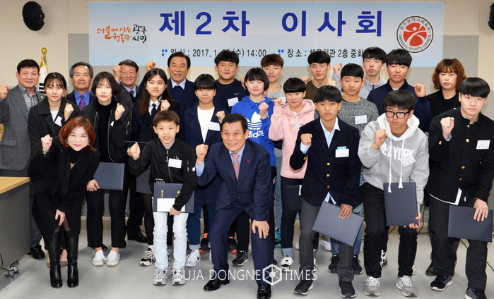 △윤장현 광주광역시장이 '제2차 이사회'에 참석해 체육인재 장학금을 수여한 후 기념촬영을 하고 있다