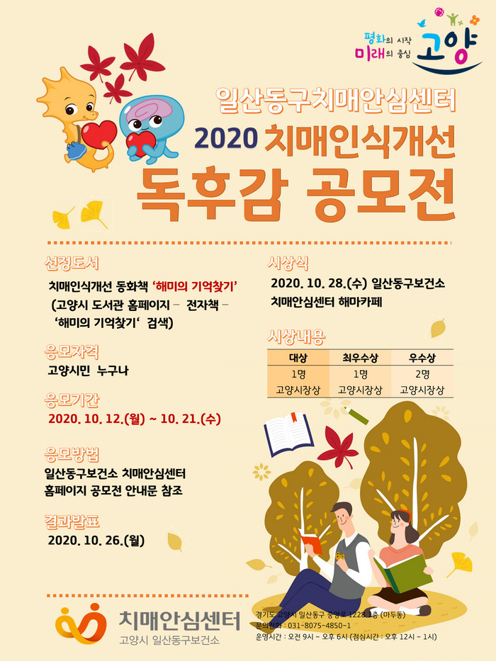 이번 공모는 고양 시민이면 누구나 참여가 가능하다. 선정도서를 읽고 독후감을 작성해 참가신청서와 함께 10월 12일부터 21일까지 이메일(kimsh20@korea.kr)로 접수하면 된다. 참가신청서는 고양시 일산동구 치매안심센터 홈페이지에서 다운로드 받을 수 있다.