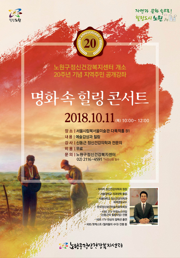 이번 강좌는 노원구정신건강복지센터(이하 ‘센터’) 개소 20주년을 기념하여 실시하는 공개강좌로 지역주민 누구나 무료로 신청할 수 있다. 접수는 정신건강복지센터(02-2116-4591) 전화접수 및 방문접수도 가능하다. 강사는 신동근 정신건강의학과 전문의로 KBS 2TV 아침뉴스타임 ‘힐링타임’, KBS 1TV ‘천상의 컬렉션’, KBS 팟캐스트 ‘힐러들의 수다’ 등 다수의 정신건강 분야의 강연 및 방송에 출연한바 있다.