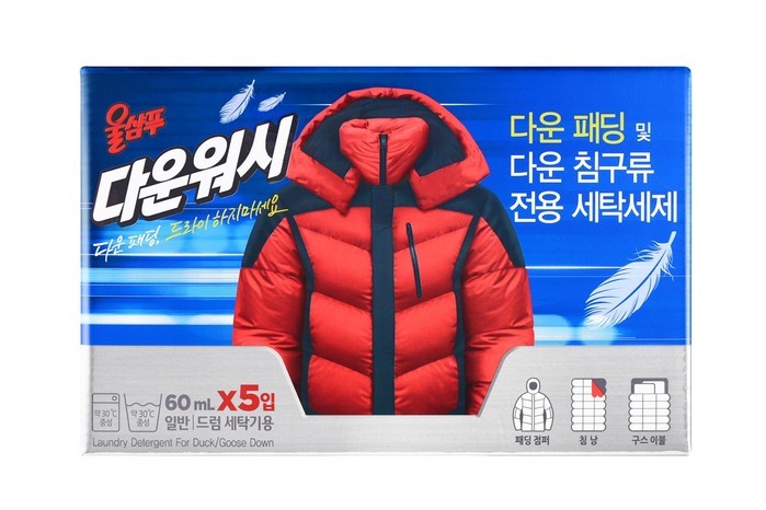 다운의류 전용 중성세제인 애경산업 ‘울샴푸 다운워시’는 다운의류의 보온 기능성을 유지해주며 손세탁이나 일반세탁기, 드럼세탁기 모두 사용할 수 있어 편리하다. 특히 다운의류 1벌 세탁에 맞게 개별 포장돼 있어 사용이 간편하고 경제적이다.