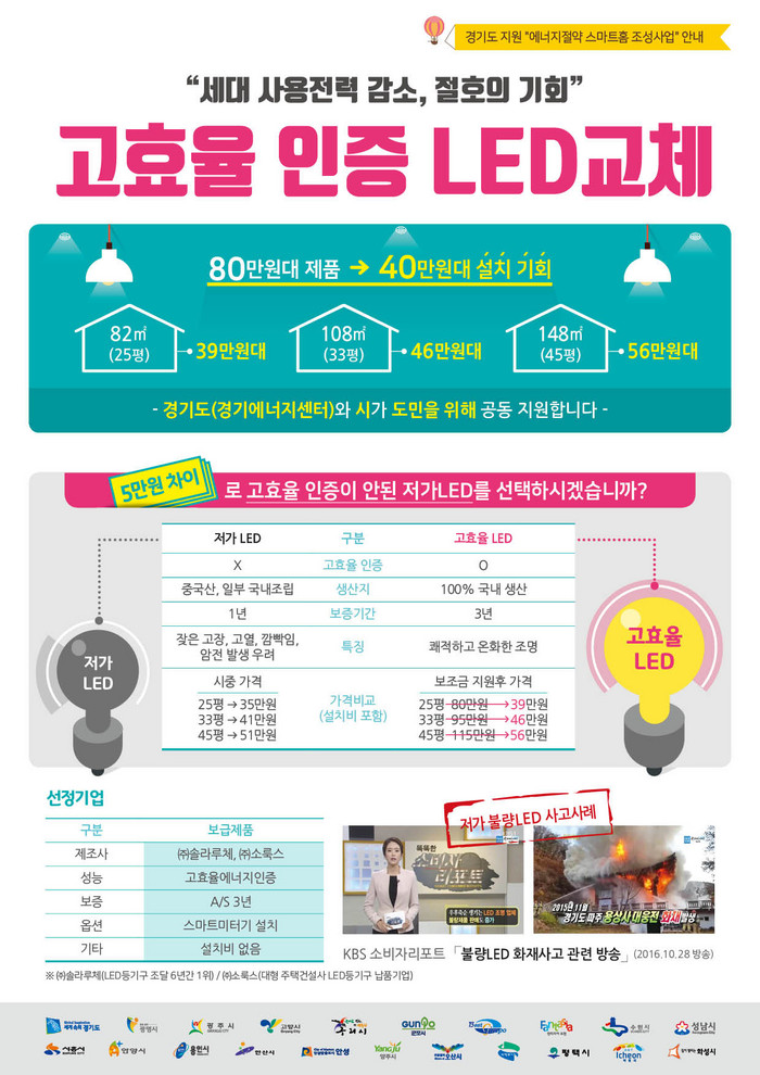 가격 부담으로 사업 참여를 망설이는 시민을 위한 이번 지원금 상향 조치로, 일반적인 저가형 LED 설치가격에서 약 5만 원의 추가비용 부담으로 우수제품을 설치할 수 있어 큰 호응이 기대된다.