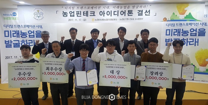 [부자동네타임즈 이현재 기자]NH농협은행은 농협미래농업지원센터(센터장 이대엽)와 함께 지난 17일 경기도 안성시 소재 농협미래농업지원센터에서 진행한 「제2회 농업핀테크 아이디어톤」을 성황리에 마치고 시상식을 개최했다고 밝혔다.