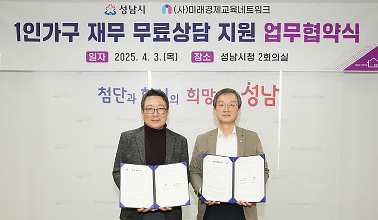 | ▲ 1인 가구 재무 무료 상담 지원 업무 협약 후 이옥원 미래경제교육네트워크 이사장(왼)과 이진찬 성남시 부시장(오른)이 기념사진을 찍고 있다 |