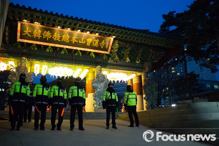 | △ 조계사 지키는 복면 경찰들 |