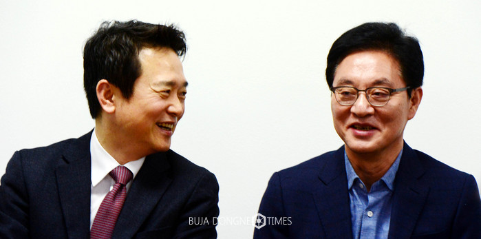 5일 오후 서울 여의도 남경필 선거 캠프 사무실에서 열린 기자간담회에 바른정당 대권주자인 남경필 경기도지사와 정두언 선대본부장이 웃으며 이야기를 나누고 있다. 2017.02.05.