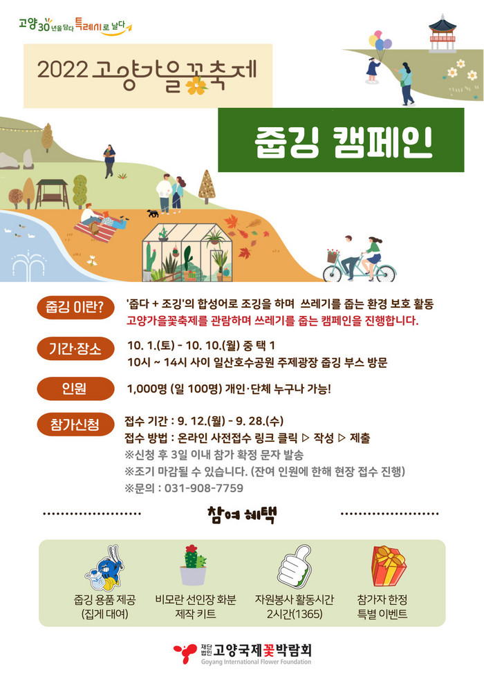 [부자동네타임즈 김인수기자] (재)고양국제꽃박람회(이사장 이동환)는 10월 1일부터 10일까지 개최되는 2022고양가을꽃축제에서 진행되는 줍깅 캠페인의 참가자를 모집한다고 밝혔다.