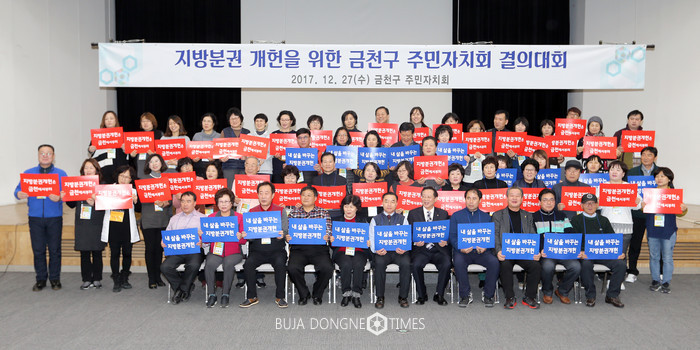 금천구(구청장 차성수)가 최근 지방분권 개헌을 위한 주민자치회 결의대회를 개최하고 ‘지방분권 1천만 서명운동’에 적극 나선다고 밝혔다.