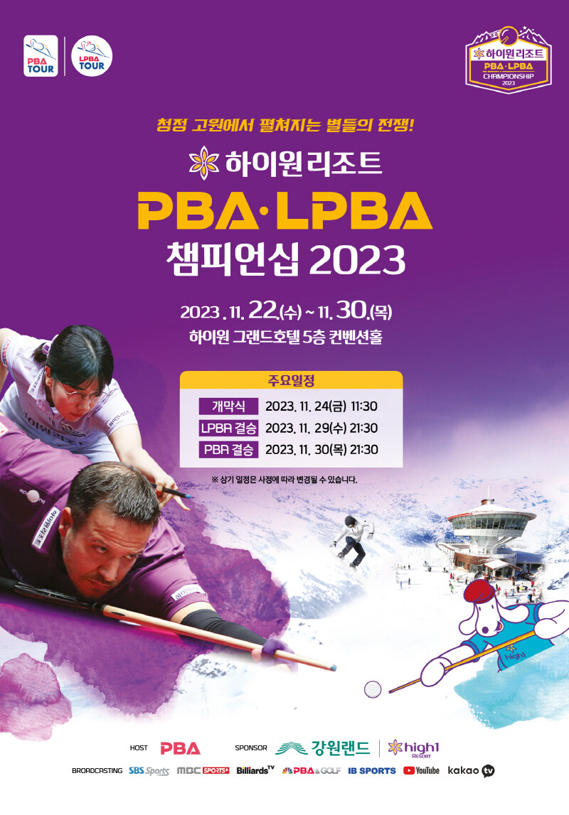 [부자동네타임즈 = 김인수 기자] 프로당구협회(PBA·총재 김영수)는 오는 22일부터 30일까지 9일간 강원도 정선군 하이원 그랜드호텔 컨벤션타워 컨벤션홀에서 ‘하이원리조트 PBA-LPBA 챔피언십 2023’을 개최한다고 밝혔다.
