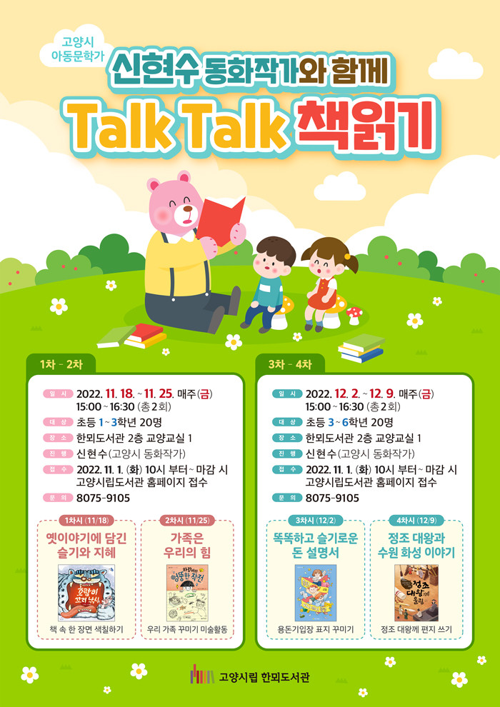 [부자동네타임즈 김인수기자] 고양특례시(시장 이동환) 한뫼도서관이 11월 18일부터 12월 9일까지 어린이와 고양시 거주 동화작가가 직접 소통하는 프로그램 신현수 동화작가와 함께 Talk Talk 책읽기을 운영한다.