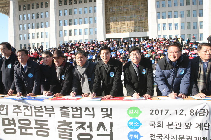 [부자동네타임즈 이병도 기자]이해식 강동구청장은 지난 8일(금) 오후 국회본관 계단 앞에서 열린 <전국자치분권개헌 추진본부> 출범식에 공동대표 자격으로 참석했다. 이날 이해식 구청장을 비롯해 지방자치단체장, 국회의원, 시민 등 1000여 명이 한 자리에 모여 본격적인 자치분권개헌 운동에 돌입하는 것을 천명했다. 이 구청장은 참석자들과 함께 추진본부 출범 선언문을 선포하고 천만인 서명운동에 참석하는 것은 물론 지방분권 개헌을 향한 염원을 담은 종이비행기를 날리기도 했다.
