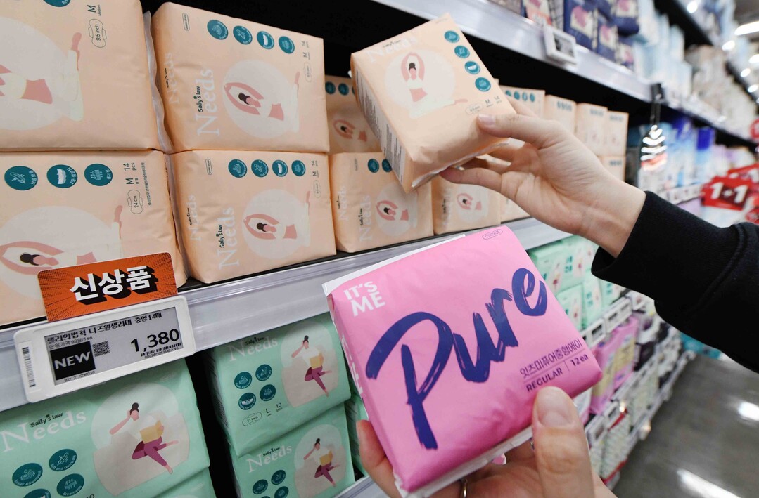 [부자동네타임즈 = 서소민 기자] 홈플러스가 지난달 28일 대형마트 단독으로 출시한 초저가 '99원 생리대' 초도 물량이 열흘 만에 모두 팔렸다고 19일 밝혔다. 사진은 서울 강서구 홈플러스 매장에서 '샐리의법칙 니즈원 생리대'와 '잇츠미 퓨어 생리대'가 진열된 모습. 2026.3.19 [홈플러스 제공]