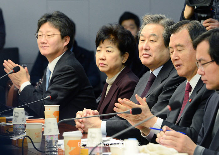 바른정당 김무성(왼쪽 세번째) 의원과 유승민(왼쪽) 의원이 13일 오전 서울 여의도 국회 의원회관에서 열린 전체회의에 참석하고 있다. 2016.01.13.
