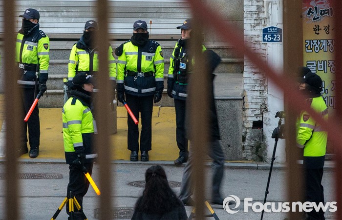 (서울=포커스뉴스) 8일 오전 서울 종로구 조계사 인근에서 경찰 병력들이 근무를 서고 있다.