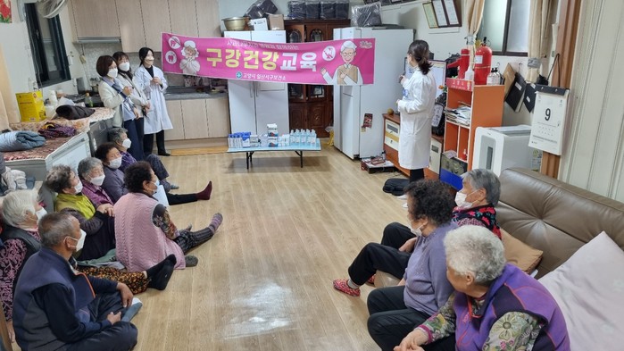 [사진설명] 치위생사가 경로당 이용 어르신을 대상으로 구강 건강 교육을 실시하고 있다.