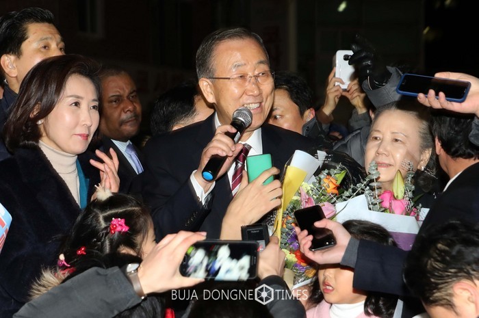 반기문 전 UN사무총장이 12일 오후 서울 동작구 사당동 자택 앞에서 주민들의 환대 속에 인사말을 하고 있다. 2017.01.12