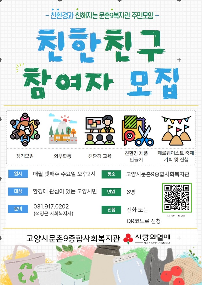 [부자동네타임즈 김인수기자] 고양시 문촌9종합사회복지관이 8월 30일부터 친환경 주민 모임 ‘친한 친구: 친환경과 친해지는 문촌9복지관 주민모임’을 운영한다. 복지관은 참여 주민 6명을 모집한다고 10일 밝혔다.