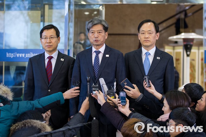 (서울=포커스뉴스) 11일 오전 서울 종로구 남북회담본부에서 황부기(가운데) 통일부 차관이 남북당국회담을 출발하기 전 취재진의 질문에 답하고 있다. 황 차관을 수석대표로 한 우리 대표단 3명은 이날 오전 회담본부를 출발, 북한 개성공단 종합지원센터 6층 회의실에서 전체회의를 여는 것으로 회담을 시작할 예정이다.