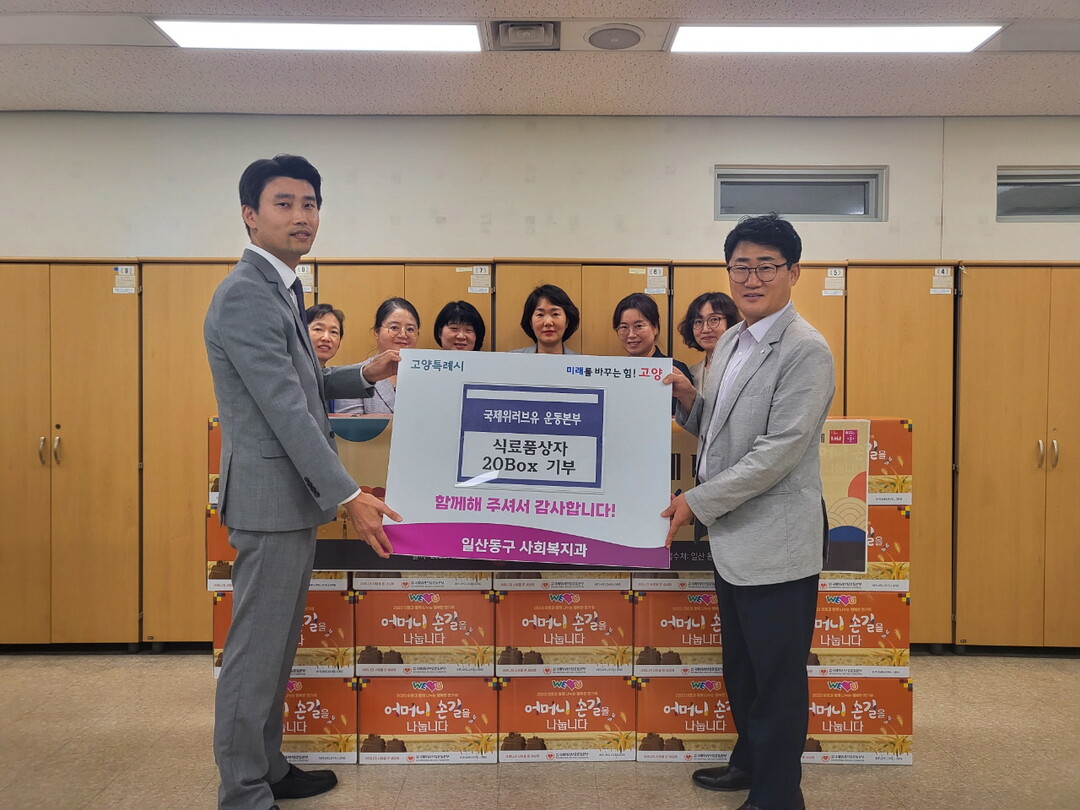 [부자동네타임즈 = 김인수 기자] 고양특례시 일산동구는 지난 11일 ‘고양난다(복지나눔 1촌맺기)’사업의 일환으로 (사)국제위러브유운동본부(이하 위러브유)‘고양장항지부’로부터 이웃과 함께 나누는 풍성한 추석을 위한 식료품 20상자(100만원 상당)을 기탁 받았다고 밝혔다.
