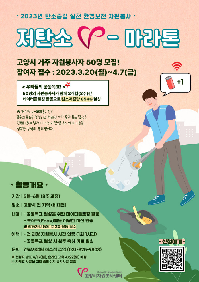 고양시 거주자라면 누구나 신청할 수 있으며, 신청방법은 고양시자원봉사센터 홈페이지를 확인하거나, 홍보 포스터의 QR코드를 스캔하여 신청하면 된다.