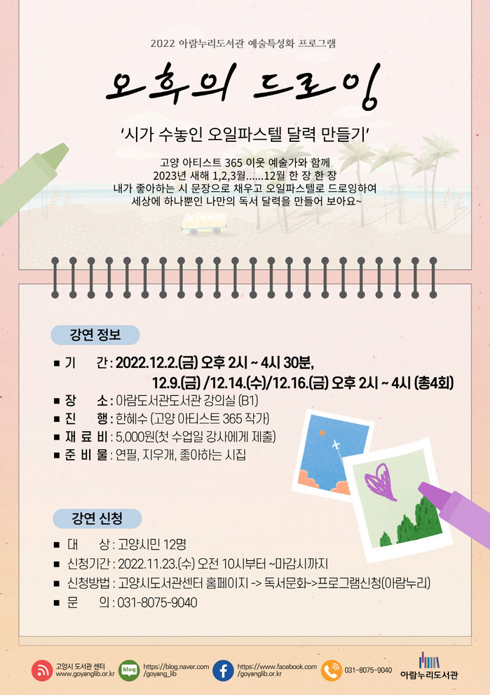 오후의 드로잉은 고양아티스트 365 한혜수 작가와 함께 2023년 월별로 좋아하는 시집 문구를 적고 오일파스텔로 드로잉하여 나만의 새해 독서 달력을 만드는 프로그램이다.