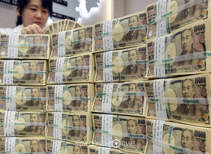 원·엔 환율이 하락세를 보인 15일 서울 중구 KEB하나은행에서 외환출납관계자가 엔화를 정리하고 있다. 이날 엔화는 두 달 만에 1000원선이 무너졌다. 2017.02.15.