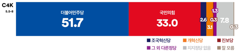‘여론조사꽃’이 5월 5일부터 6일, 5월 7일부터 8일에 각각 이틀씩 진행한 전화면접조사 결과를 합산, 분석한 결과, ‘더불어민주당’은 51.7%의 지지율로 ‘국민의힘’(33.0%)을 18.7%p 앞서는 것으로 나타났다. ‘조국혁신당’은 2.6%를 기록했으며, ‘더불어민주당’과 ‘조국혁신당’의 합산 지지율은 54.3%로, ‘국민의힘’보다 21.3%p 높았다.