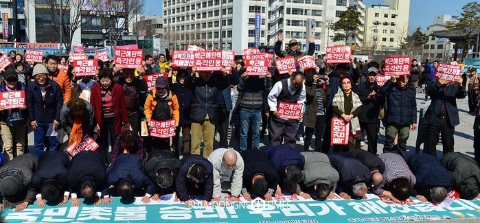 | △장휘국 교육감은 10일(금) 오전 5·18민주광장에서 생중계로 헌법재판소 탄핵심판 결과를 윤장현 시장과 임추섭 대표, 정영일 대표 등 시민들과 함께 지켜봤고 탄핵 인용 선고가 나오자 환영의 절을 올리고 있다. |