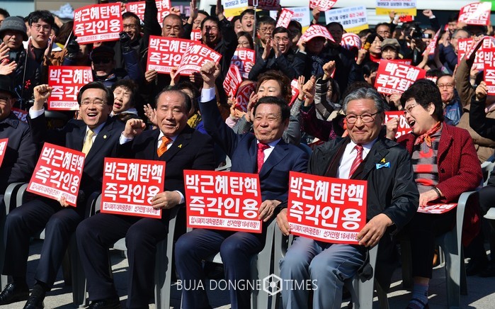 | △장휘국 교육감은 5·18민주광장에서 윤장현 생중계로 헌법재판소 탄핵심판 결과를 윤장현 시장과 임추섭 대표, 정영일 대표 등 시민들과 함께 지켜봤다 |