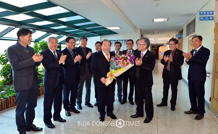 헌법재판소의 탄핵격과 발표를 5·18민주광장에서 윤장현 시장 등 시민들과 함께 지켜본 장휘국 광주시교육감이 본청 간부들로부터 꽃다발을 전해 받았다.