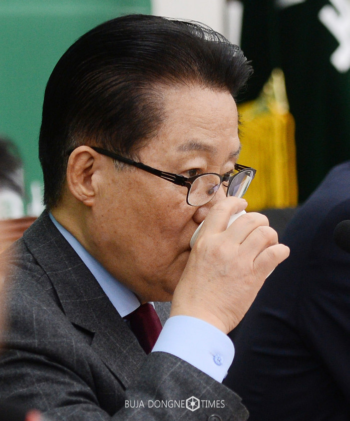 국민의당 박지원 대표가 14일 서울 여의도 국회에서 열린 박근혜 정권퇴진 비상국민행동 대표단 간담회에서 물을 마시고 있다. 2017.02.14.