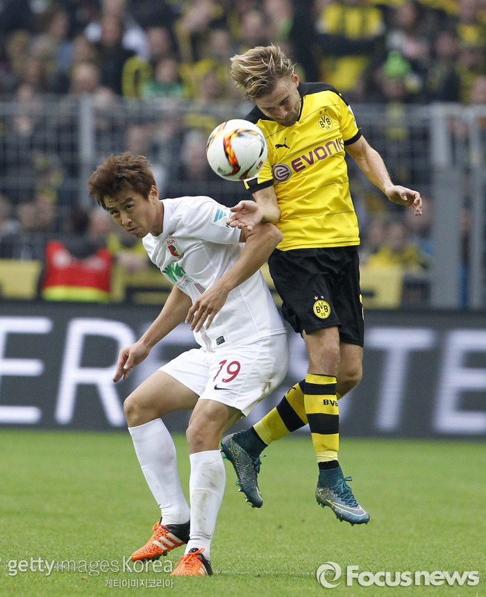 △ <도르트문트/독일=게티/포커스뉴스> 아우크스부르크 소속 구자철이 25일 오후(한국시간)에 열린 도르트문트와의 분데스리가 10라운드 원정경기에서 마르셀 슈멜처와 볼 소유권을 다투고 있다. (C)게티이미지/멀티비츠