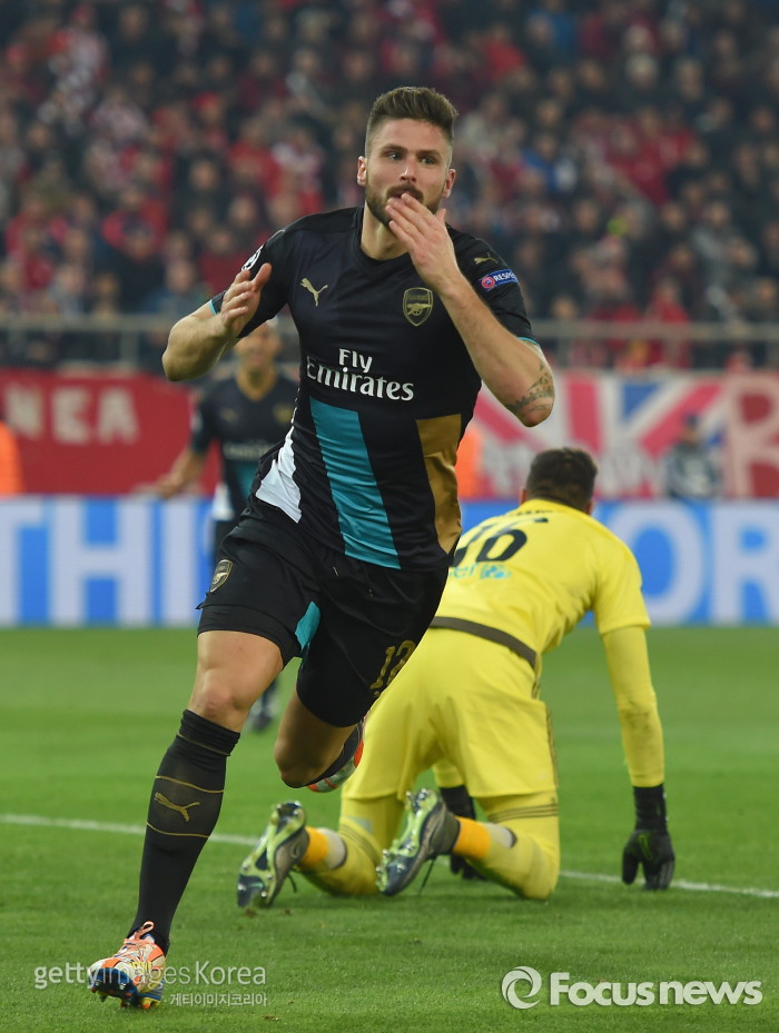 △ <피래우스/그리스=게티/포커스뉴스> 아스날 공격수 올리비에 지루가 12월10일 새벽(한국시간) 올림피아코스와의 챔피언스리그 조별라운드 6차전 원정경기에서 득점을 올린 뒤 환호하고 있다. (C)게티이미지/멀티비츠