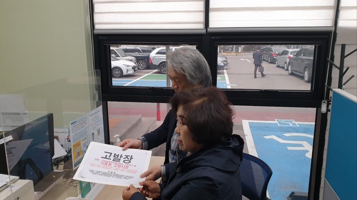 [사진설명] 법률대리인 조영관 변호사와 함께 고양경찰서에 고발장을 접수한 (사)고양풀뿌리공동체 센터대책위는 고양 경찰서에 고발장을 제출하고 있다.