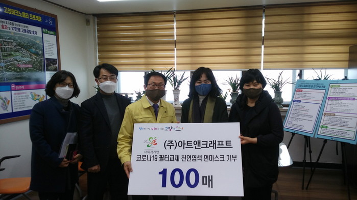 [부자동네타임즈 김인수기자] 고양시(시장 이재준)는 지난 18일 사회적기업 ㈜아트앤크래프트에서 코로나19 감염 예방을 위한 200만원 상당의 필터교체 천연염색 면마스크 100매를 기부했다고 밝혔다.