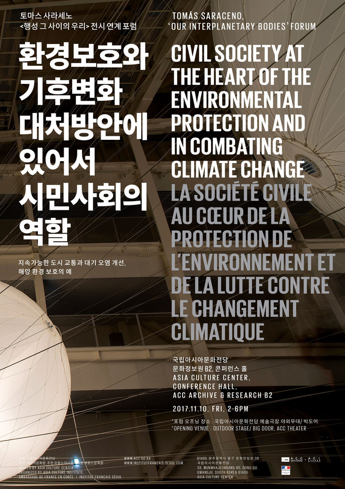 또한 이번 포럼은 현재 ACC에서 진행되고 있는 토마스 사라세노 <행성 그 사이의 우리> 전시와 맥락을 공유한다. 이 전시 작업의 근간이 되는 <에어로센(Aerocene)>은 2015년 파리기후변화회의 개최 일환으로 그랑팔레(Grand Palais)와 팔레드도쿄(Palais de Tokyo)에서 전시된 바 있다. 이번 포럼에도 소개될 <에어로센>은 지구 환경과 공존할 수 있는 새로운 방식에 대한 상상력을 활성화하며 이를 위한 지역과 시민단체의 결집과 실천의 중요성에 대해 사유할 수 있는 단초를 제공할 것이다.