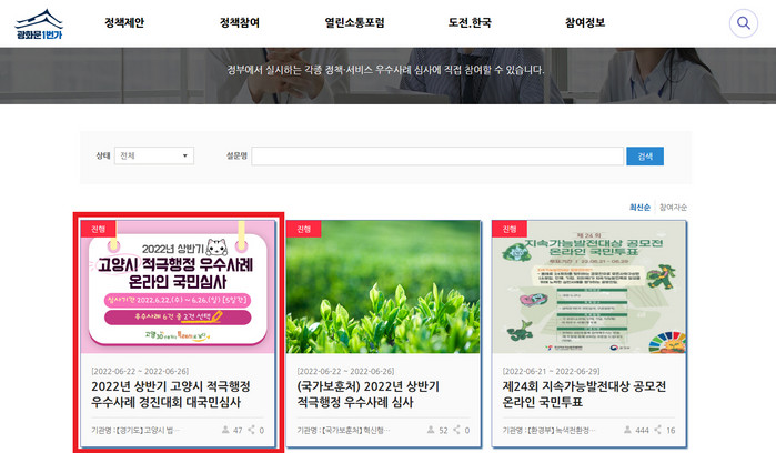 [부자동네타임즈 김인수기자] 고양시가 오는 6월 28일 ‘2022년 상반기 적극행정 우수사례 경진대회’를개최한다. 시는 온라인 국민심사를 광화문1번가 홈페이지 국민심사 코너에서 6월 26일까지 진행한다고 밝혔다.