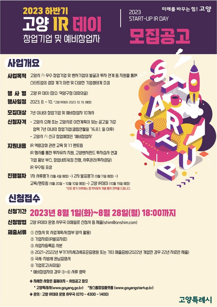 [부자동네타임즈 김인수기자] 우수한 창업·벤처기업을 발굴하고 창업가와 투자자와의 만남의 장을 마련하기 위해 ‘2023 하반기 고양 IR-데이’를 운영한다. 시는 8월 28일(월)까지 참여할 창업 기업을 모집한다.