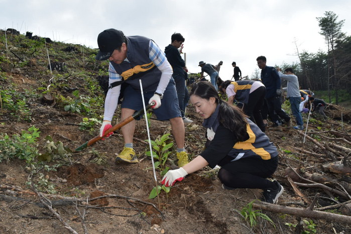 이날 행사에는 KB국민카드 임직원과 직원 가족 등 40여 명이 참가해 8천 여 제곱미터 면적의 임야에 소나무 등 묘목 2600그루를 심었다.